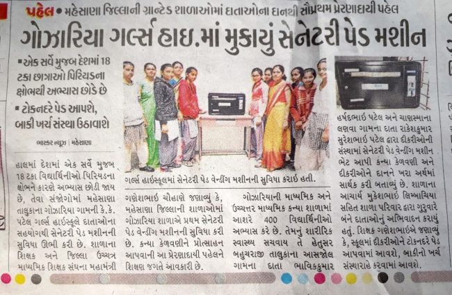 શ્રી કે.કે.પટેલ ગર્લ્સ હાયર સેકન્ડરી સ્કુલ માં મુકાયેલ સેનેટરી પેડ મશીન નું વિચારબીજ મૂકનાર શ્રી દિલીપભાઈ નાથ સાહેબ ની વાત ને વ્યાયામ શિક્ષક શ્રી વિપુલભાઈ પટેલ એ જવાબદારી થી સ્વીકારી અને એમના મિત્રો શ્રી ભાવિક્કુમાર હર્ષદભાઈ પટેલ તથા શ્રી રાજેશકુમાર સુરેશભાઈ પટેલ લણવા ના વતનીઓ એ કાર્ય ને સફળ બનાવ્યું એ બદલ સંસ્થાના આચાર્યશ્રી મુકેશભાઈ…